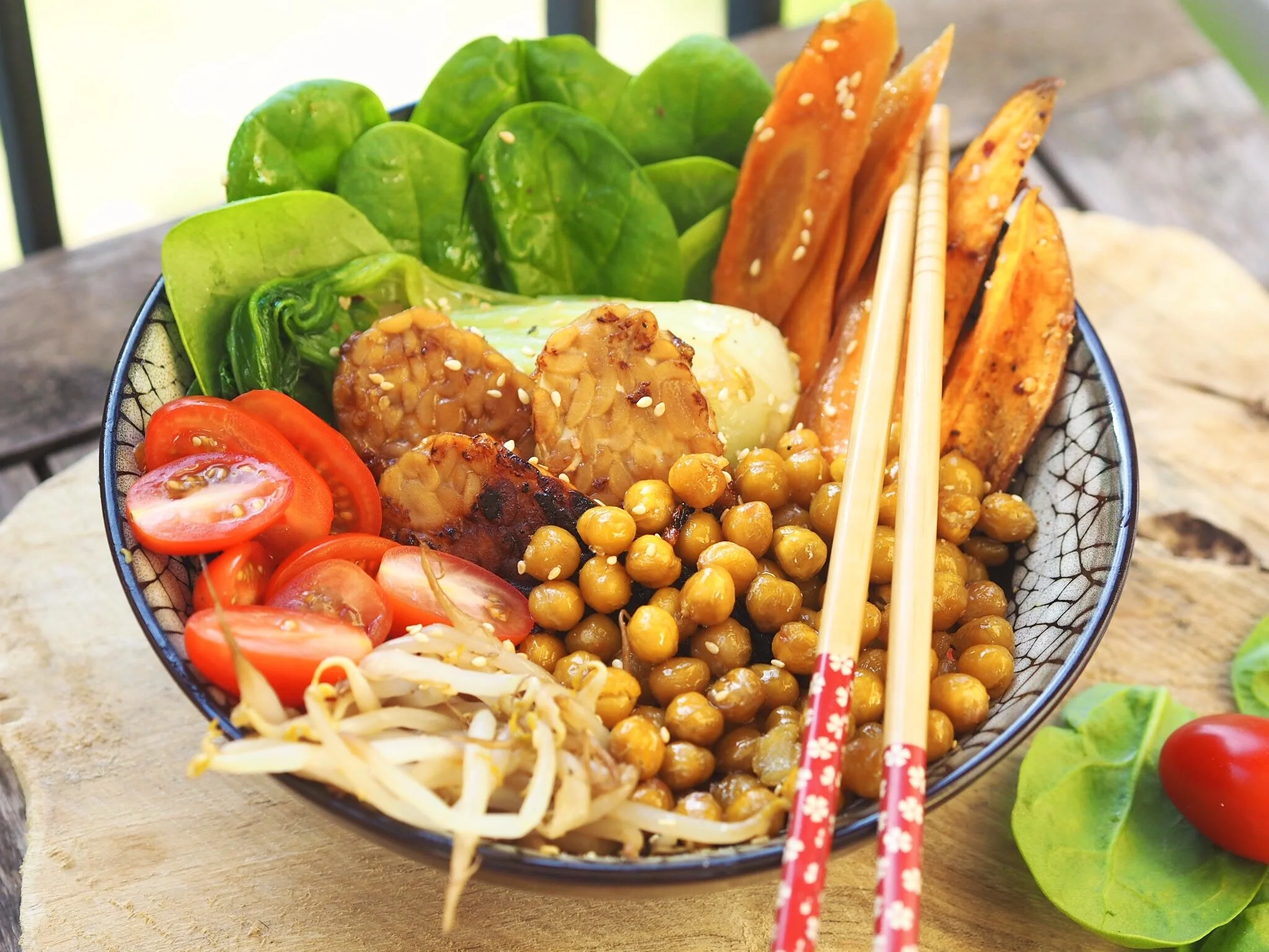 Put a large frying pan on a high heat, add the peanut oil. Add the garlic, ginger, vinegar, honey, peanut butter and soya sauce. Add the tempeh slices.