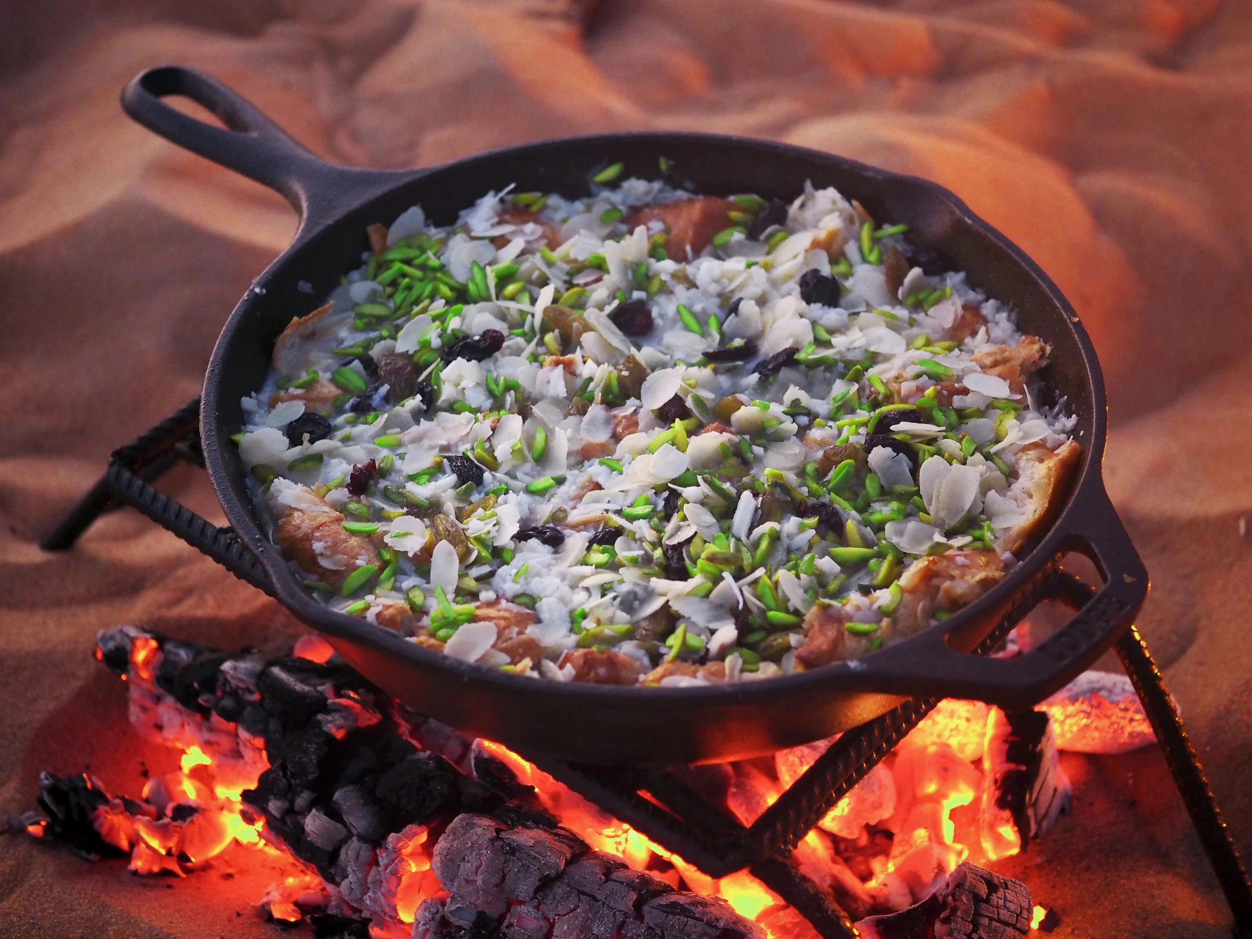 In a 10 inch cast iron skillet arrange the croissant pieces and bake until they get slightly crispy.